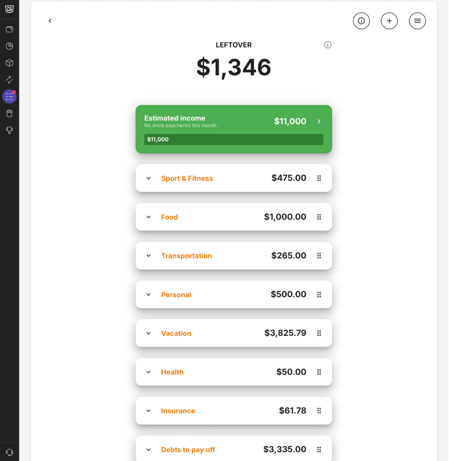 Once we define your bills and subscriptions, we predict them in your leftover for the current month.
