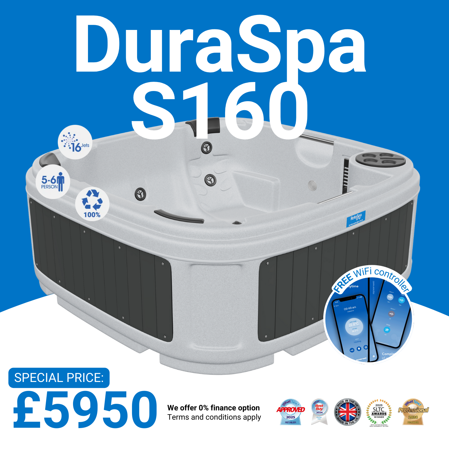 Greetings from the garden spa professionals at RotoSpa! We’re chuffed to present our premier luxury hot tub, the DuraSpa S160. This indulgent square hot tub provides a blissful hydrotherapy experience for up to 6 people. Handcrafted in Britain with care and quality, our innovative construction ensures your DuraSpa S160 will deliver years of soaking pleasure. It features two full-depth lounge seats and a captain’s seat and incorporates an internal step that doubles as a child/cooldown seat.